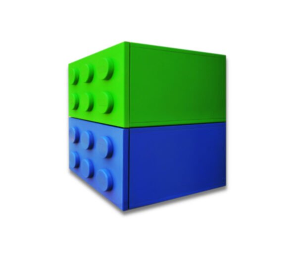 Par de buros con forma de bloque de construccion , fabricados en mdf y lacados con pintura base agua, cada uno con cajon. Medidas 40×28.5×25
